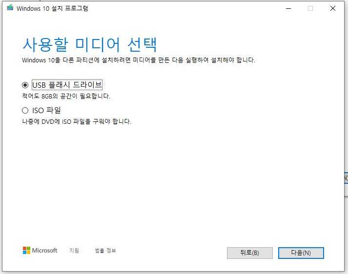 사용할 미디어 선택 항목이 뜬다면 USB 플래시 드라이브 항목을 체크 해주시고 다음을 눌러주세요.
