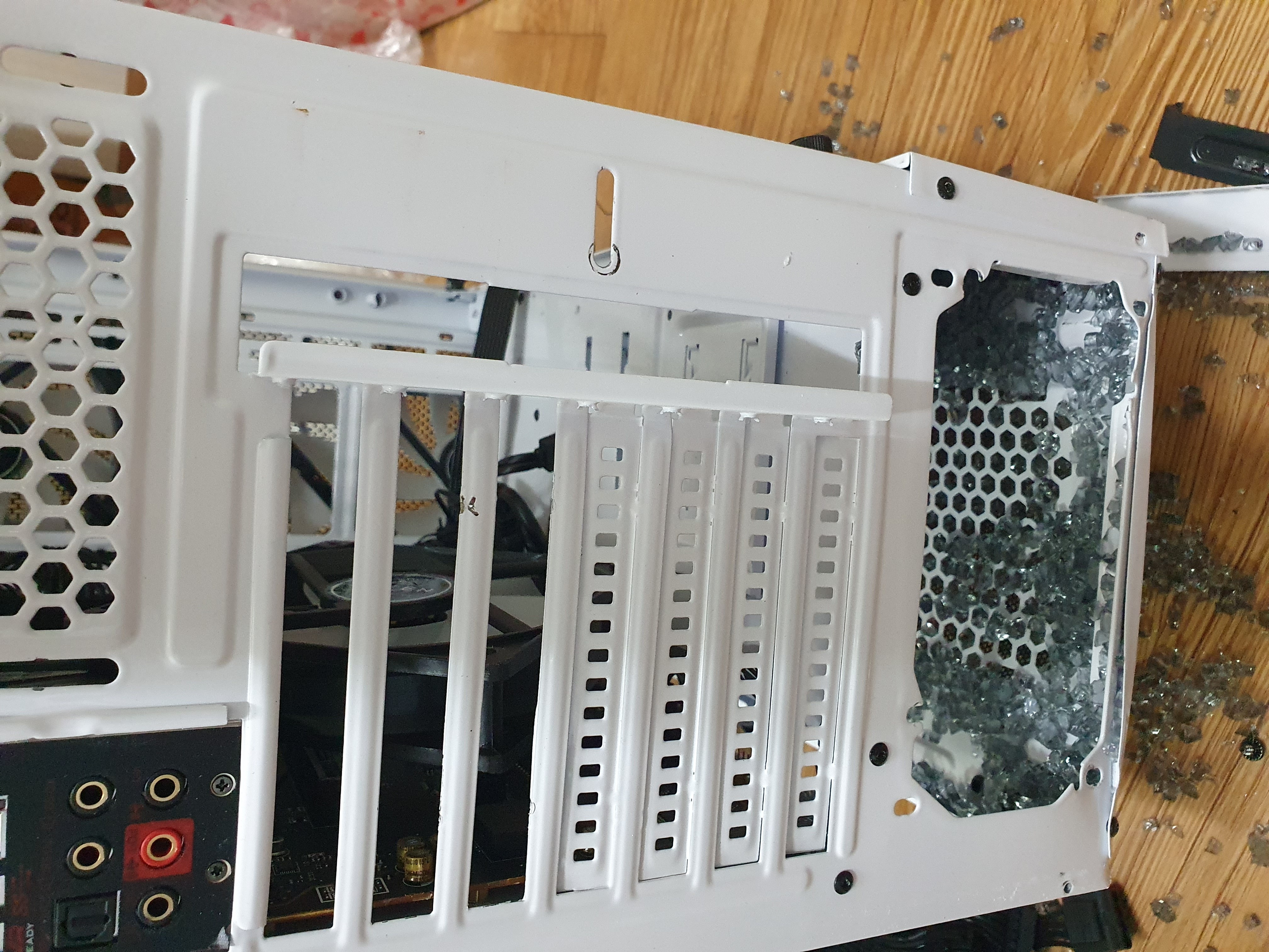 내부 사진은 cpu쿨러와 그래픽카드를 황급히 떼어내고 기타 쿨링팬들도 빼내는 와중에 찍은 사진입니다.